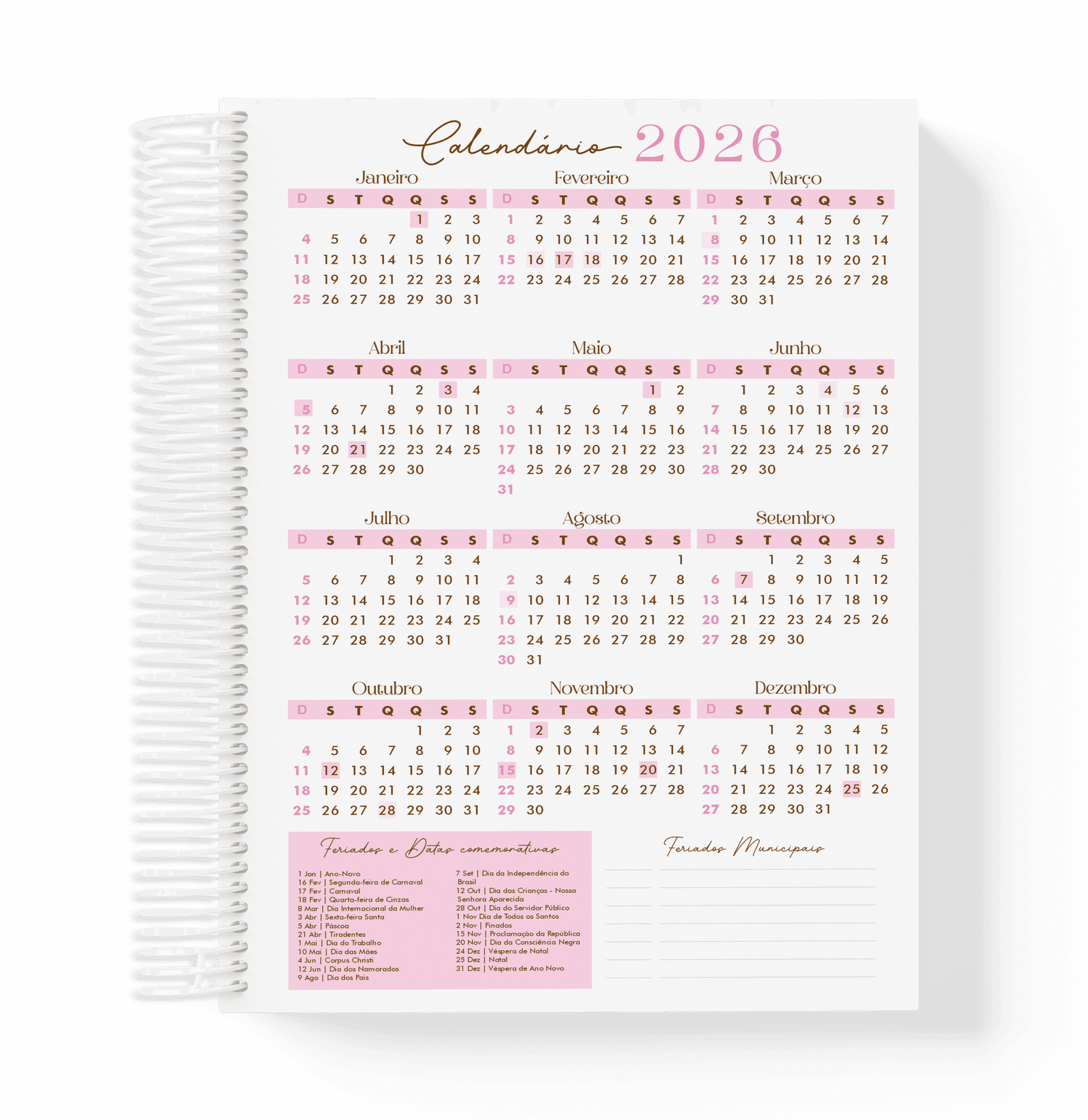 Calendários atualizados de 2026 e 2027 com feriados;